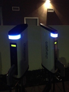 We checked in and drove around back to hook up to one of the five chargers that beckoned us with their glowing blue lights. A Tesla was hooked up to one, but the other four ChargePro chargers were free. So far, so good.